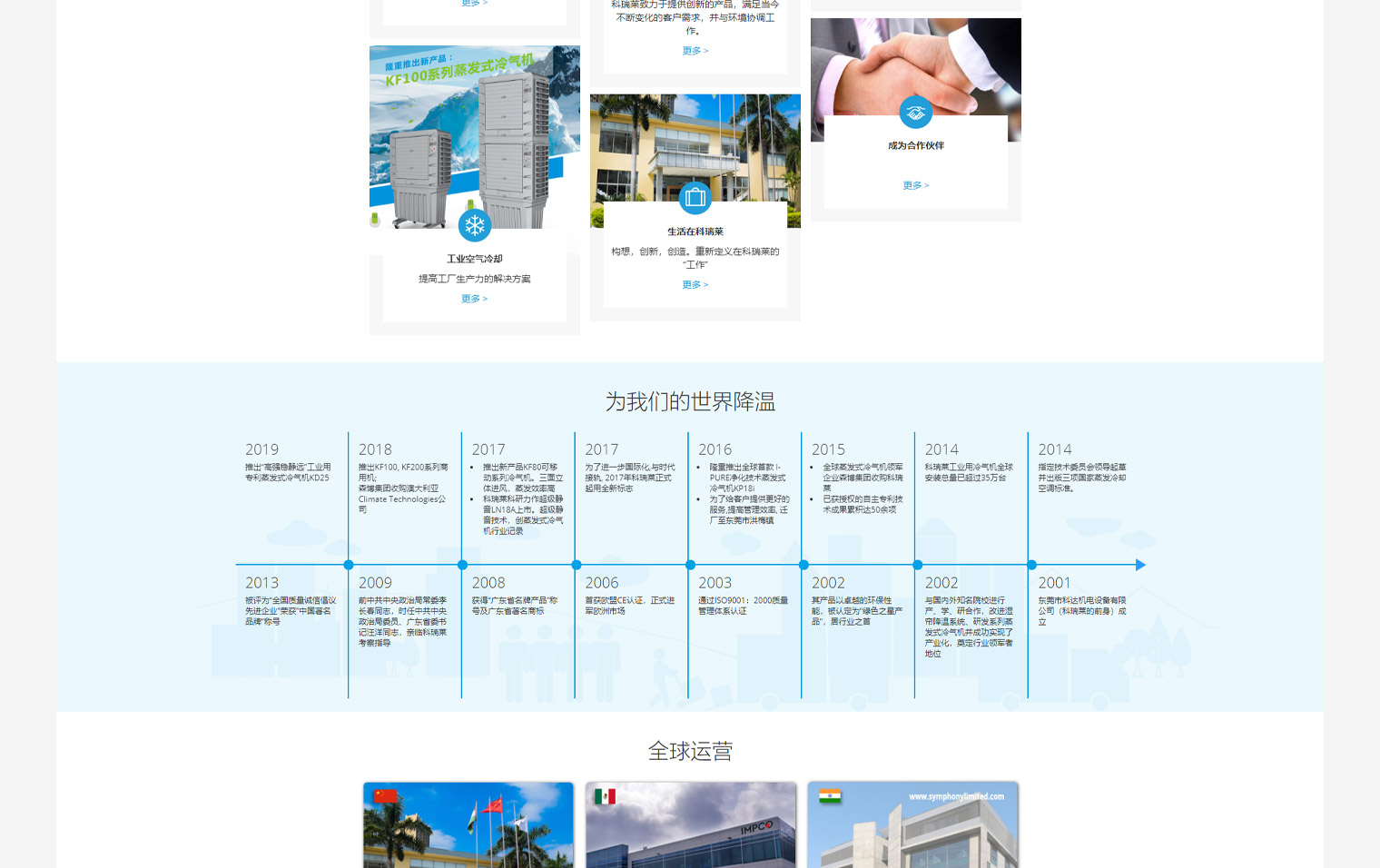 科瑞莱公司成立于2001年,经过多年的积累,已经成功发展为一家集研发设计、生产加工、销售服务于一身的大型国际化外资企业。自成立以来,科瑞莱一直专注于蒸发式冷气机、冷风扇产品的研发与生产。科瑞莱研发生产的蒸发式降温产品实现了从300 CMH到100,000 CMH风量的全面覆盖,可以充分满足客户需求。科瑞莱产品已销往全球50多个国家与地区。